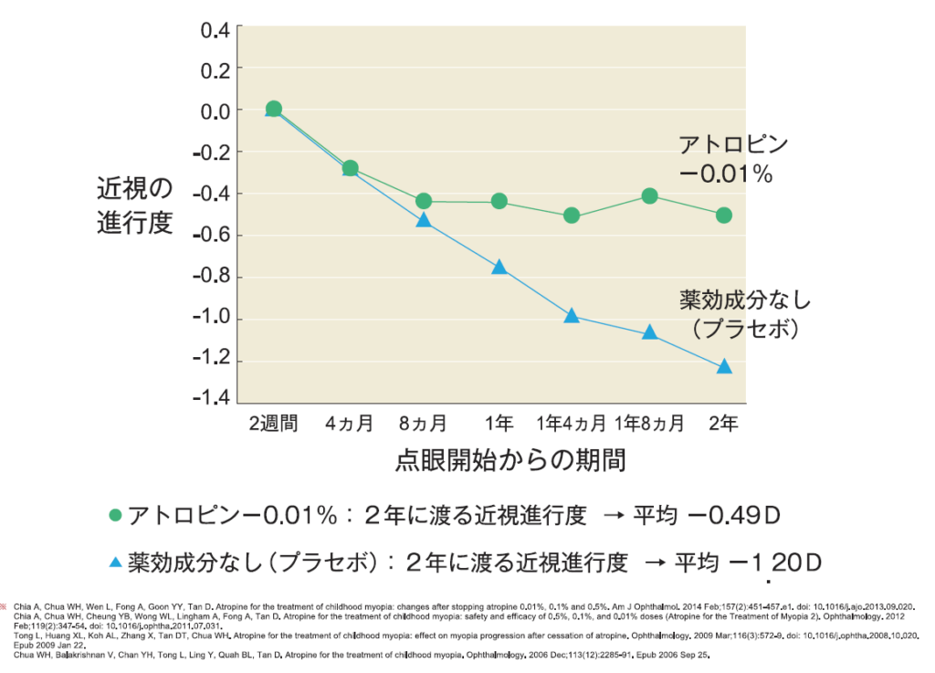 点眼を行わない場合に比べて近視度数の進行が平均50~60%抑制され、点眼を中止した後も効果が持続することが示されました。