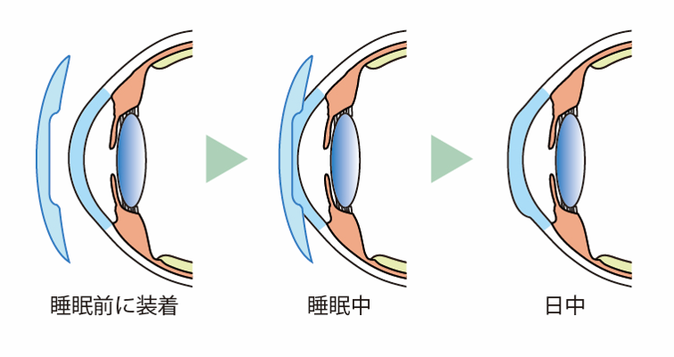 カーブの弱いハードコンタクトレンズを睡眠時に装着して一時的に角膜の形状を平らにし、近視を軽減します。レンズを外しても一定時間はその形状が続くので、日中は裸眼で過ごすといったことが可能になります。また、オルソケラトロジーは、眼軸の延長が抑制される(通常の眼鏡やコンタクトレンズ比で平均30~60%の抑制効果)ことが多くの研究により示され、比較的信頼性の高い治療法と言えます。ハードコンタクトの装用に抵抗がある場合は、装用が困難なことがあります。適切な処方や管理を怠ると角膜感染症など失明につながる重篤な合併症を起こすこともあります。常に大人の管理の元で、ガイドラインを遵守して使用することとなっています。