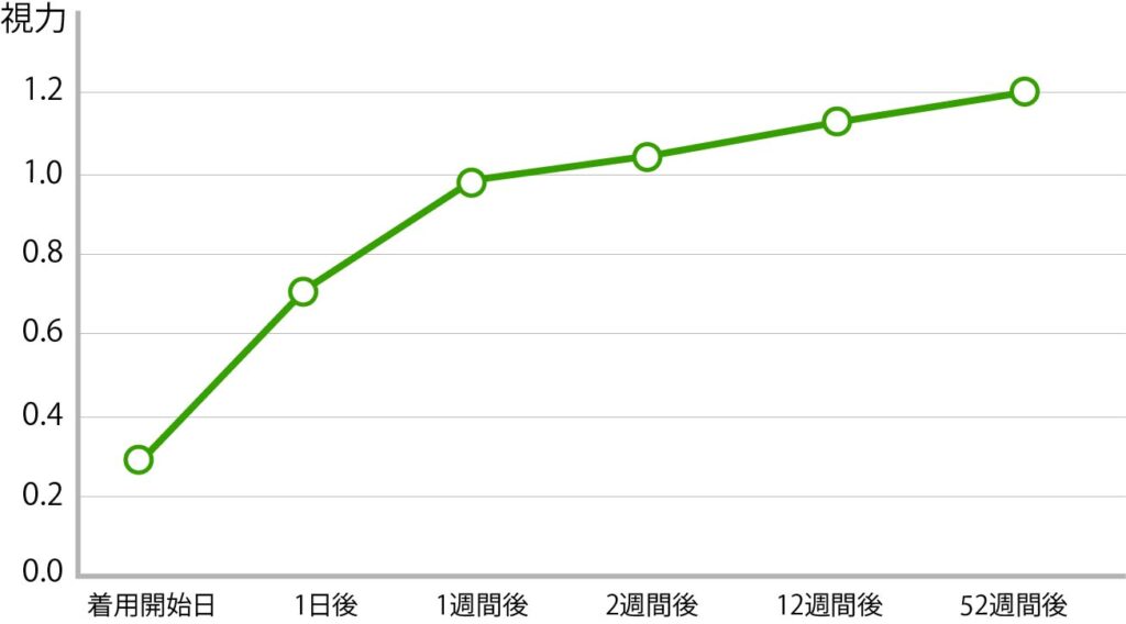 装用開始時に平均0.3だった裸眼視力が、1週間後には、平均1.0にまで改善され、その後の視力はは安定しています。